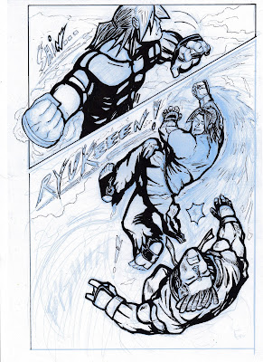 Hoy quería que vierais una de las páginas en las que estoy enfrascado y que estoy cogiendo con ganas. Se trata de una lucha entre Ken Masters, y su discipulo Sean, quien hizo aparición por vez primera en la tercera entrega de la saga.